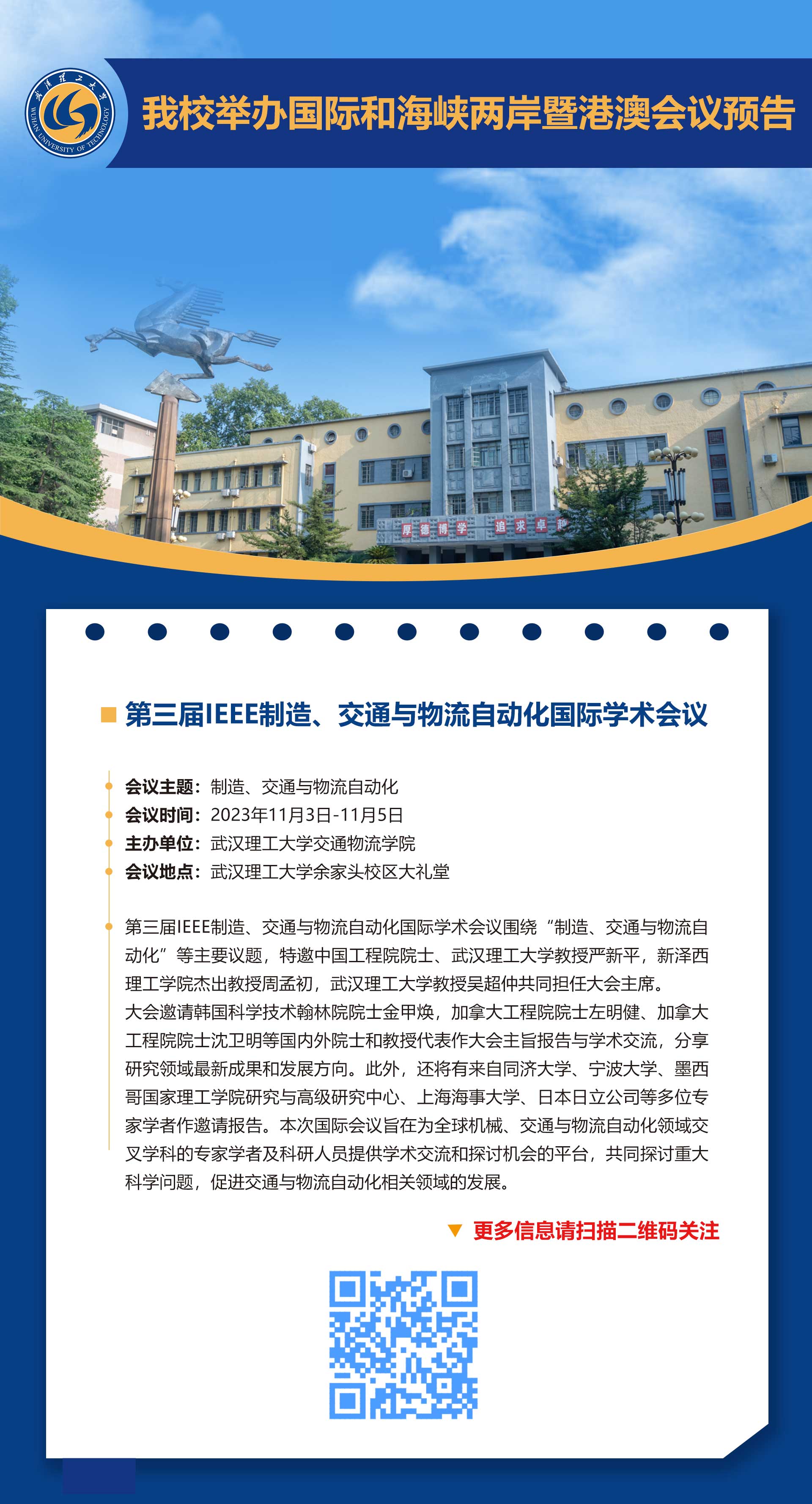 为进一步落实学校国际化发展战略,搭建高质量国际会议平台,赋能高水平学科建设,现预告我校2023年11月上旬举办的国际和海峡两岸暨港澳会议,相关会议信息如下: