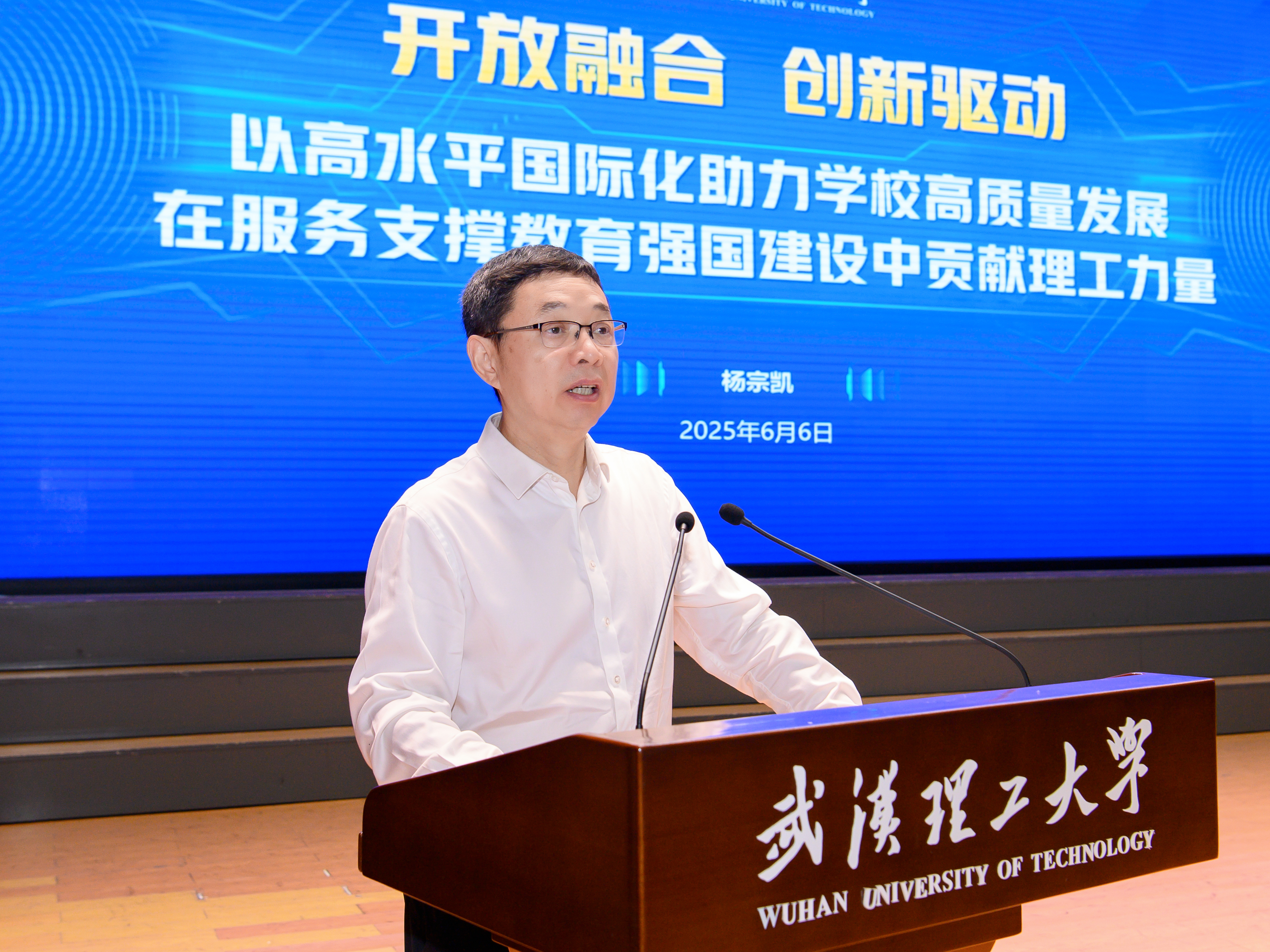 杨宗凯以《开放融合 创新驱动 以高水平国际化助力学校高质量发展 在服务支撑教育强国建设中贡献理工力量》为题作主旨报告,他从国际化发展的重要意义、战略目标、实施路径三个方面来和与会师生深入探讨,定理工之位、彰理工之特、担理工之为,提出构建高水平国际化“理工范式”。他深刻阐释了以高水平国际化助力学校高质量发展的重要意义,全面深入分析了当前形势下加快推进学校国际化高质量发展的紧迫性,擘画了学校国际化工作的战略定位和目标。