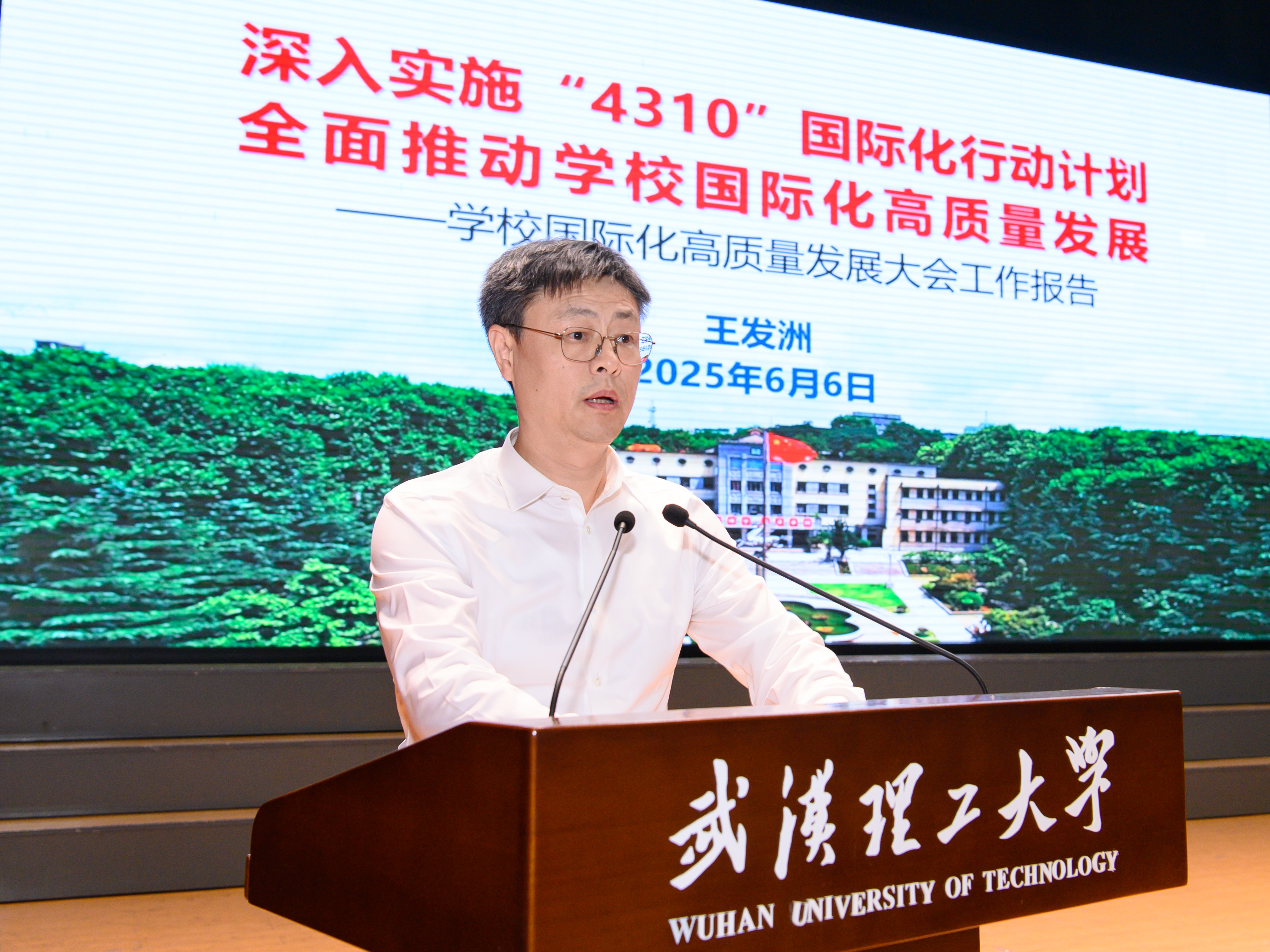 他要求,全校上下坚持以习近平新时代中国特色社会主义思想为指导,聚焦助力国家建设具有全球影响力的重要教育中心,坚持“六位一体”实施国际化战略,奋勇拼搏、勇往直前,全力打好教育对外开放“攻坚战”,奋力开创国际化高质量发展新局面,努力建成特色高水平国际化示范高校,全面彰显学校在建材建工、交通、汽车等行业的全球引领力,在教育强国建设中展现武汉理工大学的时代担当!